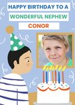 Front of card: Card features a cute illustration of a male character blowing on birthday cake above this a small Photo upload. Text reads: "Happy Birthday to Wonderful Nephew Conor".