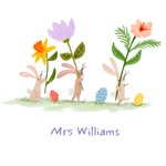 A cheerful, Illustrative design featuring three cute rabbits holding tall spring flowers above a grassy hill with patterned Easter eggs on a white background.