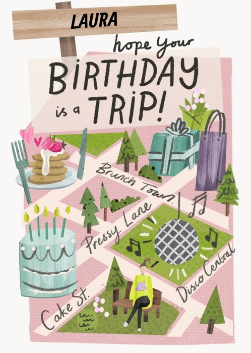 "Laura. Hope your birthday is a trip! Brunch Town. Pressy Lane. Cake St. Disco Central."