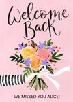 Front of card: 'Welcome back' Card Illustration of a bouquet of flowers on a pink background. Text reads: "Welcome back we missed you Alice". 'We missed you Alice!' can be personalised!