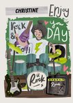Illustration of a girl playing the drums surrounded by an amp, a guitar, a vinyl record and a rock and roll poster. The caption reads editable recipient's name, non editable Enjoy your day, U Rock. The card background colour is grey.