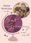 Front of card: 'Best Grammy' Photo Upload Birthday Card Illustration of a globe and a circular photo frame surrounded by hearts on a pink background. Text reads: "Happy birthday to the best Grammy in the world".