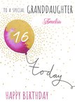 Front of card: Granddaughter's 16th Birthday Card Illustrations of a pink balloon covered in gold glitter with the number 16 on and the string spelling the word 'today' surrounded by speckles of gold glitter on a white background. Text reads: "To a special Granddaughter Amelia", "16 today" and "Happy Birthday". 'Amelia' and '16' can be personalised!