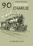 Contemporary illustration of a steam train on a green background. The editable caption reads 90 Happy Birthday Grandad Charlie You're First Class