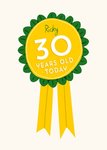 Front of card: 30th Birthday Card Illustration of a yellow and green rosette on a cream background. Text reads: "Ricky 30 years old today". 'Ricky' can be personalised!