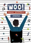 Front of card: Woo Happy Birthday Personalised Card Illustration of aman cheering in a wheelchair with his hands in the air Text reads: "Woo Happy Birthday".