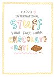 Front of card: Humorous Easter Card Illustration of chocolate with colourful typography and a frilly border. Text reads: "Happy international stuff your face with chocolate day!".