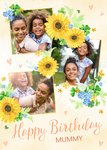 Front of card: Birthday Photo Upload Card Illustration of sunflowers and shamrocks surround photo frames on a yellow watercolour background. Text reads: "Happy Birthday Mammy". 'Mammy' can be personalised!