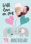 Front of card: Photo Upload Anniversary Card Illustration of two elephants with heart shaped balloons. Text reads: "With love on our 9th anniversary". '9th anniversary' can be personalised!