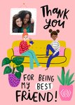 Front of card: Best Friend Photo Upload Thank You Card Illustration of two woman on a settee talking. Text reads: "Thank you for being my best friend!".