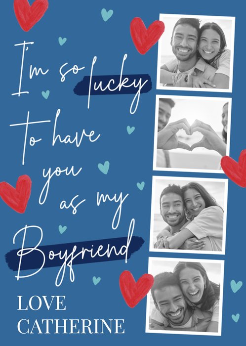 Front of card: Featuring handwritten typography surrounded by hearts with four photo frames. Text reads: "I'm so lucky to have you as my boyfriend love Catherine". 'Catherine' can be personalised!