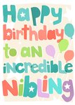 Collage style birthday card with big, playful typography and balloon illustrations on a neutral starry background.