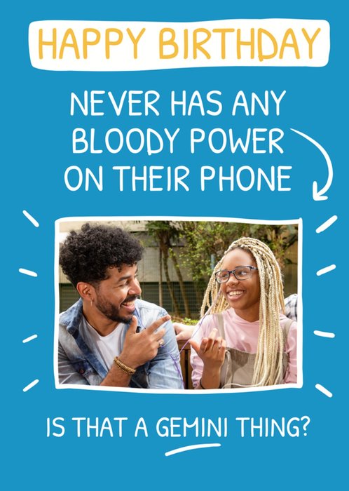 Front of card: Featuring white handwritten typography with a photo frame on a blue background. Text reads: "Happy birthday never has any bloody power on their phone is that a Gemini thing?".