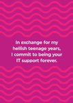 "In exchange for my hellish teenage years, I commit to being your IT support forever."