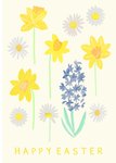 Featuring hand-painted style spring flowers, including yellow daffodils, white daisies, and a blue hyacinth, spaced across a greeting card on a pale cream background with text at the bottom.