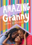 This greeting card design features a bold and vibrant background with striped lines in various colours. The photo upload area is shaped like an inverted triangle at the bottom centre of the card. The text on the card reads, “Amazing Granny Happy Birthday!”