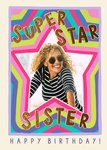 This greeting card design features a bold, colourful, star-shaped frame with multiple stripes of bright colours. The photo upload area is in the centre of the star, with the text “Super Star” placed above it in large golden font, and “Sister” below in a similar style. The text reads, “Super Star Sister Happy Birthday!”