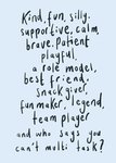 “Kind, fun, silly, supportive, calm, brave. Patient, playful, a role model, best friend, snack giver, fun maker, legend, team player, and who says you can’t multi-task?”