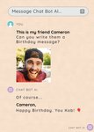 "Message Chat Bot AI... You. This is my friend Cameron, can you write them a Birthday message? CHAT BOT AI. Of course... Cameron, Happy Birthday. You Kob!"