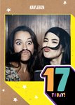 Front of card: Extra large photo upload area in centre against a brown craft paper background with white stars. In the bottom corner is a large colourful age message on a black shape and an editable name in white at the top Text reads: "Kayleigh. 17 today!" With customisable name.
