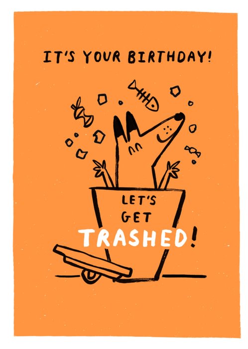 Featuring a funny illustration of a fox in a dustbin surrounded by a brush-style message. The design sits on a speckled orange background with a white edge.