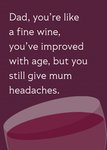 This cheeky Father’s Day greeting card features a witty wine-themed joke in crisp white text against a rich burgundy background, with a bold graphic of a tilted wine glass brimming with red wine.