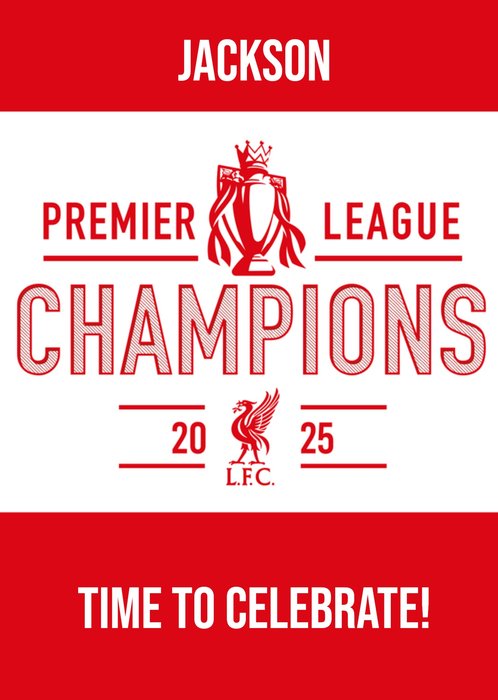 A striking football celebration greeting card for Liverpool fans, showcasing the Premier League trophy and bold champion lettering on a crisp white background with red accents.
