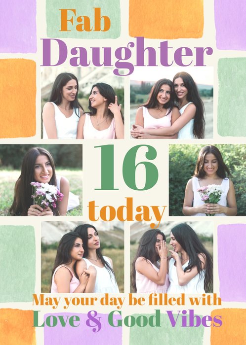 "Fab daughter today 16 today may your day be filled with love & good vibes". 'Daughter' and '16' can be personalised!