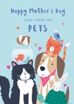 A cute and playful Mother’s Day greeting card featuring a variety of illustrated pets, including a dog, cat, rabbit, guinea pig, fish, bird, and turtle, with hearts and a soft blue background.