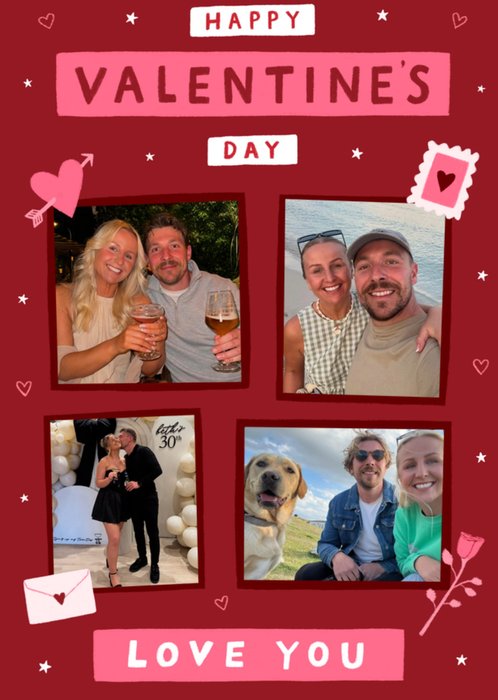 Featuring a four-photo collage layout, banners with text in, small hearts, an envelope, a cupid arrow, a stamp and a rose illustration, all on a dark red background.