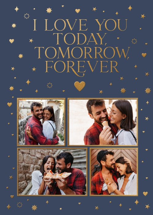 Featuring gold stars and heart illustrations surrounding a four-photo collage layout on a dark blue coloured background with gold embossed typography above.