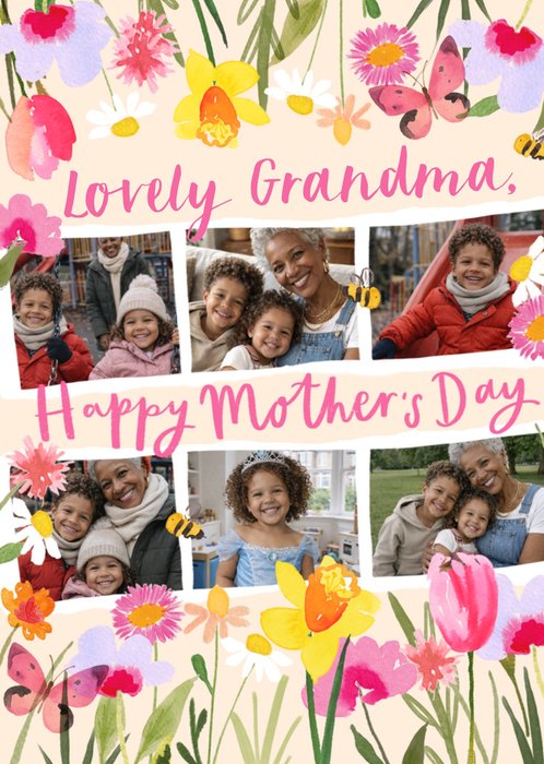 A soft, modern design featuring a floral watercolour illustration with butterflies and bees around six photo frames on a cream background.