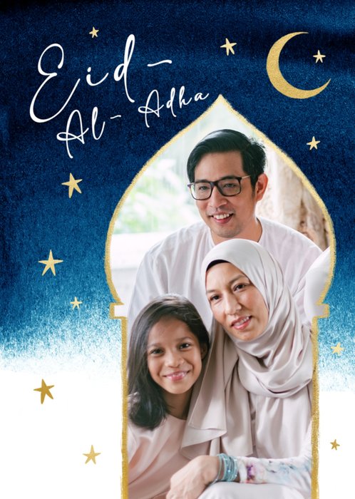 A festive Photo Upload Eid card featuring a hand-painted background that is adorned with a beautiful blend of dark and light blue hues, giving it an ethereal and serene ambience. There is one photo upload area inside a gold-trimmed, arch frame in the shape of an outlined mosque. The main text is script lettering and complemented by decorative elements like stars and a crescent moon that add to the festive atmosphere. The image conveys a sense of joy, gratitude, and faith.