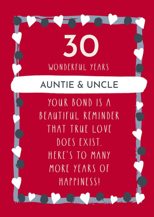 ā€œ30 wonderful years, Auntie & Uncle, your bond is a beautiful reminder that true love does exist. Here's to many more years of happiness!ā€ '30' and 'Auntie & Uncle' can be personalised!
