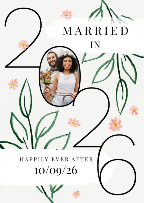 Features a large central 2023 with a photo upload frame in the 0. There are watercolour leaves and flowers around the 2023, and text above and below it.