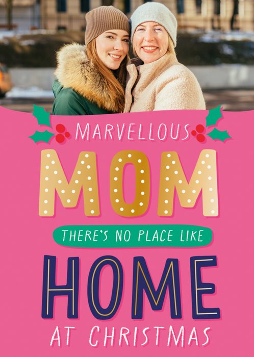 Featuring 1 photo upload area at the top of the card with bold, bright typography below on a pink background with illustrations of holly on either side of the word "Marvellous."