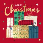 A modern festive design featuring a stack of patterned presents with bows and scattered stars on a deep red background.