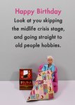 A humorous birthday card featuring a quirky doll scene where a stylish older doll skips the midlife crisis and dives straight into "old people hobbies." A fun and cheeky card for anyone embracing their golden years with humour.