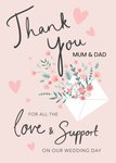 Front of Card: Illustrated foliage coming out of an envelope with script text on light pink background. Text reads: "Thank You Mum & Dad, For all the love & support on our Wedding Day." Editable text: Mum & Dad.
