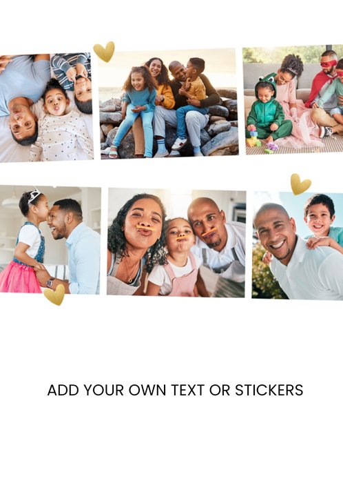 A modern, minimalist design with 6 rectangular photo frames organised in two photostrips, on a white background. You can add stickers and fully editable text, allowing you to create a truly personalised card.