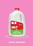 This humorous birthday card design features an illustration of a large carton of milk with a label that reads “Old but a MILF” and the phrase “365 days older with added curves, glamour & a certain je ne sais quoi,” set against a pink background, with “Happy Birthday” written at the bottom.