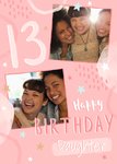 Hooray For Today. Front of card: Pink background with square photo upload frames at the top and bottom with illustrated stars aurrounding it. Text on the card reads: "13 Happy Birthday Daughter". Daughter is editable. Back of card contains: Hooray for Today logo in matching style.