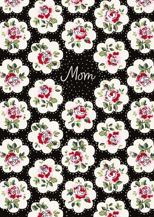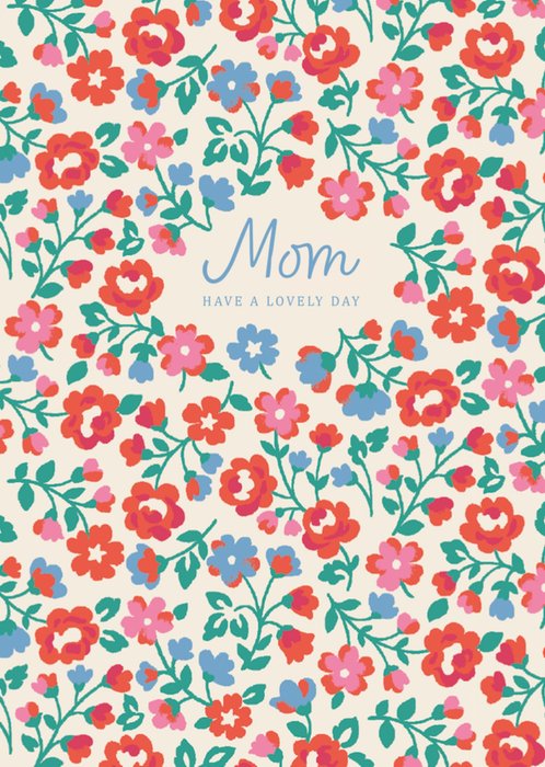 This Cath Kidston greetings card features a floral pattern with red, pink, and blue flowers intertwined with green foliage on a soft cream background, creating a cheerful and classic vintage design.
