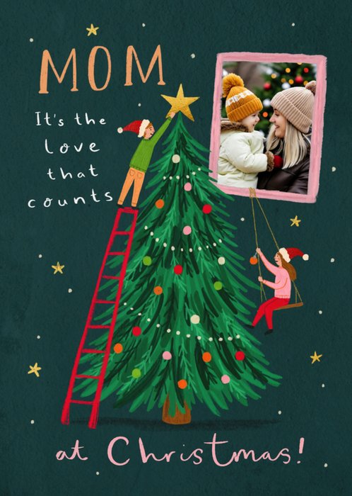 Featuring an illustration of a tall Christmas tree decorated with colourful baubles and a golden star, this festive card includes one rectangular photo upload frame outlined in pink. A child in a Santa hat climbs a red ladder to place the star on top of the tree, while another swings nearby. The dark green background is dotted with stars and festive lights, creating a joyful family scene.