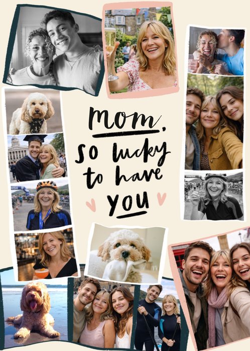 Featuring fourteen photo areas with hand-drawn scrapbook-style frames in black, white and pink around a central message on a cream coloured background.