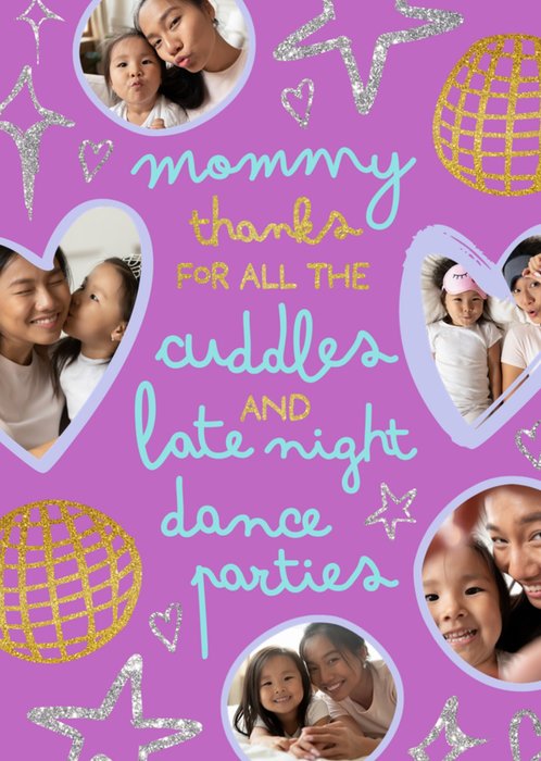 A playful and heartfelt card on a purple background featuring glittery stars, disco balls, and heart-shaped photo frames celebrating special mum moments.