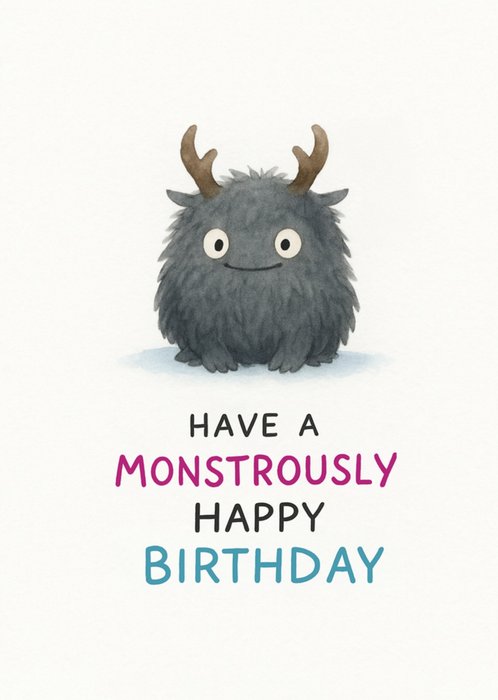 Featuring an illustration of a cute grey monster with antlers sat on a crisp white background above a playful Birthday message in black, pink, and blue text.