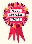 Featuring a colourful award rosette with pink ribbon tails and layered petal details, with bold text panels in the centre reading “most loveable twt”, on a cream background.