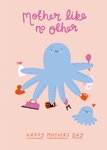 A fun and adorable illustrated Mother's Day card featuring a smiling blue octopus multitasking with various household and parenting items, including a spoon, keys, a phone, and an iron. Perfect for celebrating the super-mum in your life who does it all!