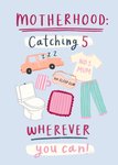 A light-hearted and relatable Mother's Day card featuring playful illustrations of a car, toilet, eye mask, and pyjamas—capturing the chaos of motherhood. The message humorously highlights the struggle of sleep-deprived mums everywhere. A perfect card for any hardworking and exhausted mum who deserves a laugh.
